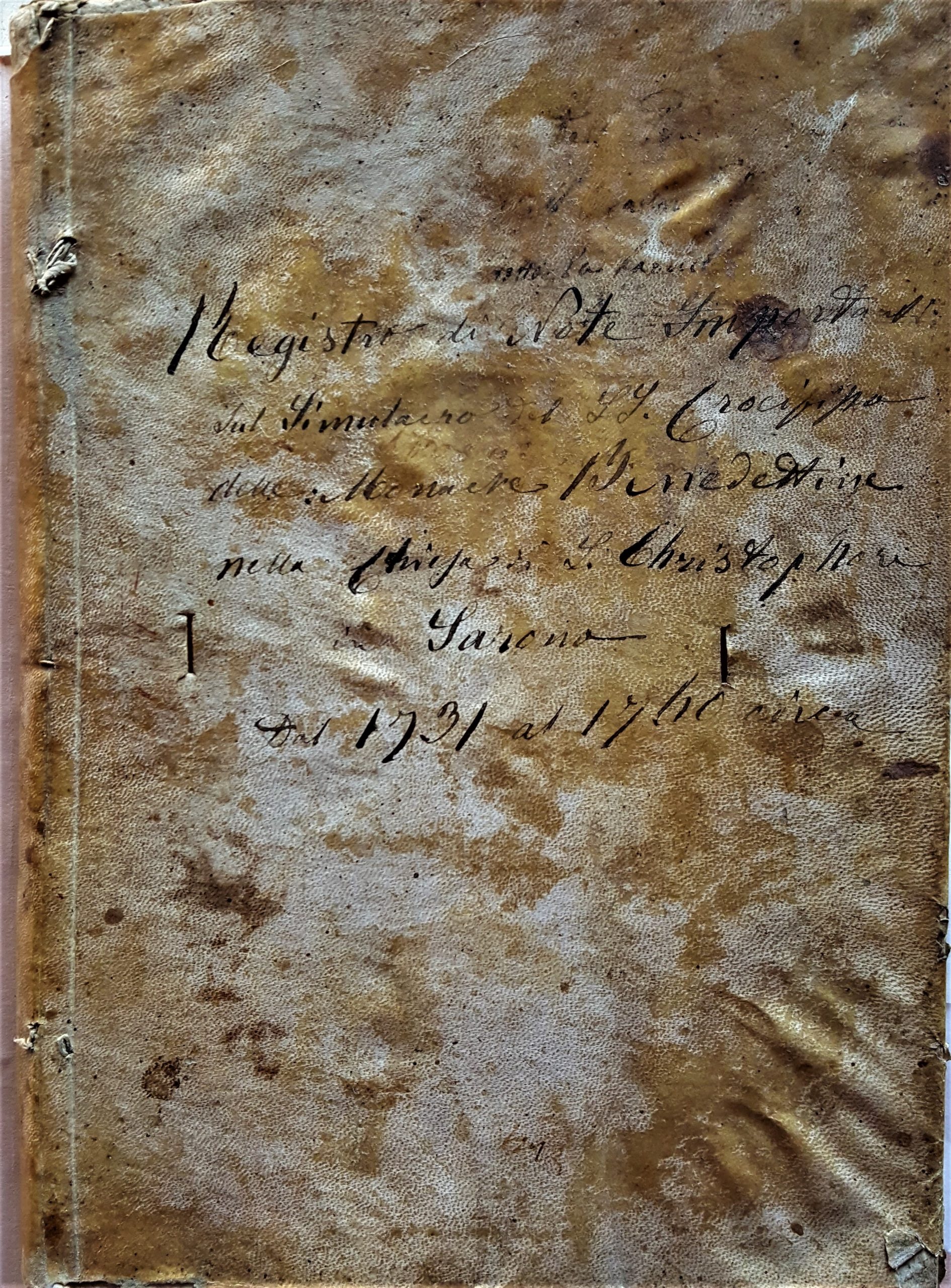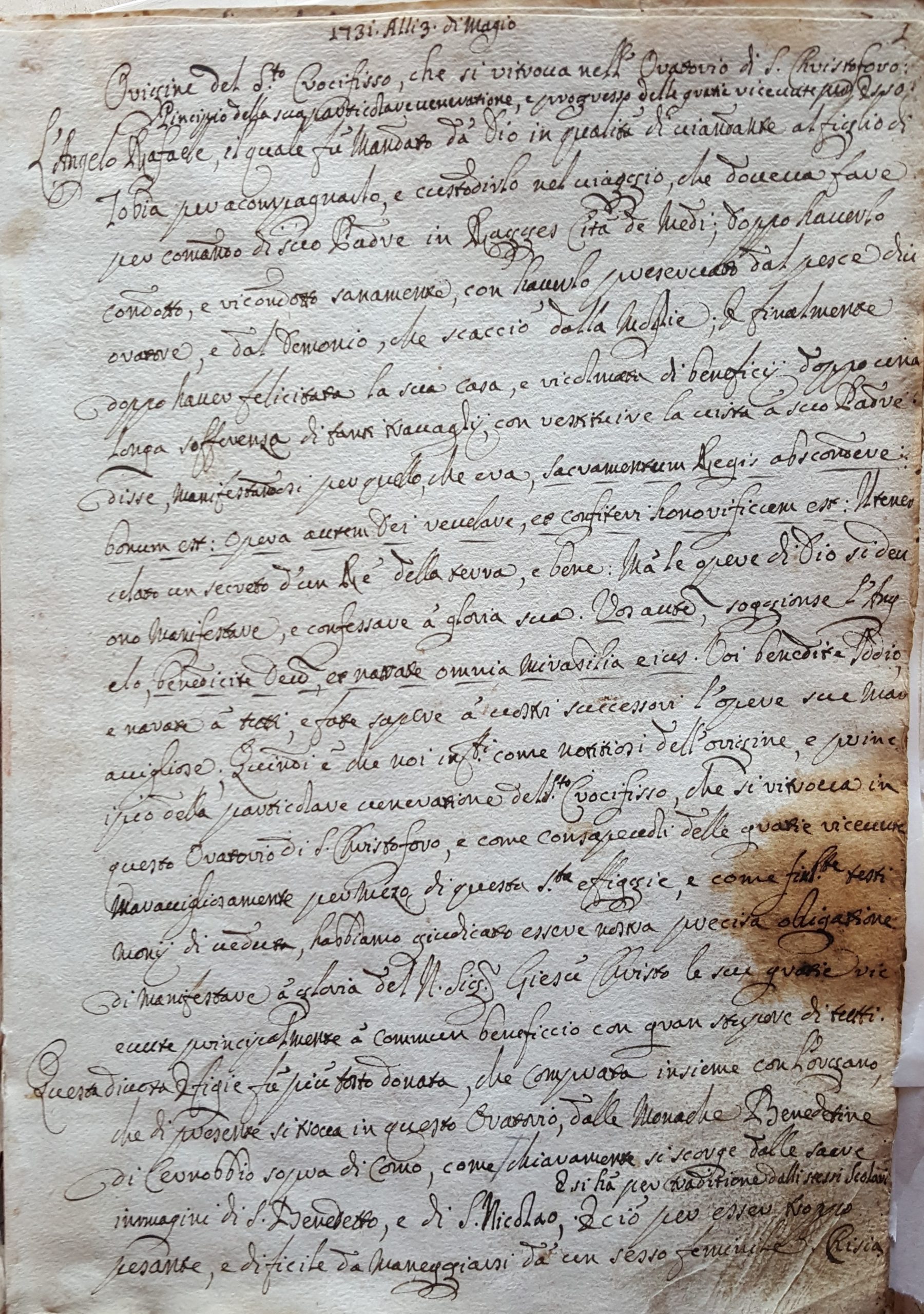 Nell’archivio della confraternita presso l’archivio del Santuario della Beata Vergine dei miracoli è infatti conservato un “Registro di note importanti sul Crocifisso” (circa 1731), il secondo documento che presentiamo, dove si legge che il simulacro fu donato più che acquistato “per gratia di Dio e della Beata Vergine e di Santo Cristoforo” a causa del peso e quindi “per essere molto pesante e difficile da maneggiare da un sesso femminile”. Il cronista ci dice anche che tradizionalmente gli scolari di San Cristoforo lo fanno provenire dal monastero benedettino di Cernobbio e questo fatto sembra fosse maggiormente supportato dal fatto che la croce originale (croce ancora presente e utilizzata nel 1740 stando alle parole dell’anonimo cronista) fosse decorata con le immagini di San Benedetto e San Nicola: quest’unica notizia riguardante la croce che originariamente doveva reggere la figura lignea del Cristo, richiama l’attenzione sui due santi ricordati, come abbiamo visto, nel monastero di Cernobbio.