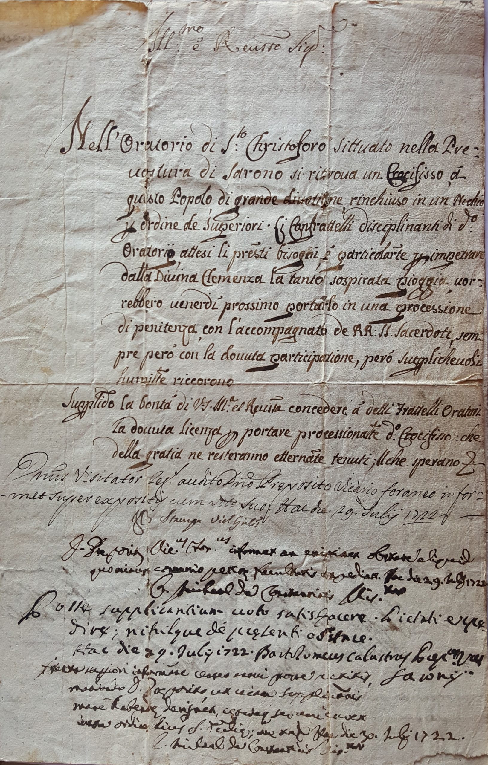 Il primo documento è un’autorizzazione vescovile per la processione che sarà detta “del Trasporto”: il coadiutore Simonetta, congiuntamente con gli scolari della confraternita di San Cristoforo, chiedono licenza di poter portare “in una processione di penitenza” il Crocifisso venerato nella chiesa di San Cristoforo “per impetrare dalla Divina Clemenza la tanto sospirata pioggia”; il 29 luglio 1722 il Vicario Generale autorizzava la prima processione che divenne fissa nell’ottobre 1783 e che tutt’ora si svolge nella quarta domenica di ottobre e che prese il nome di “Festa del Trasporto”.