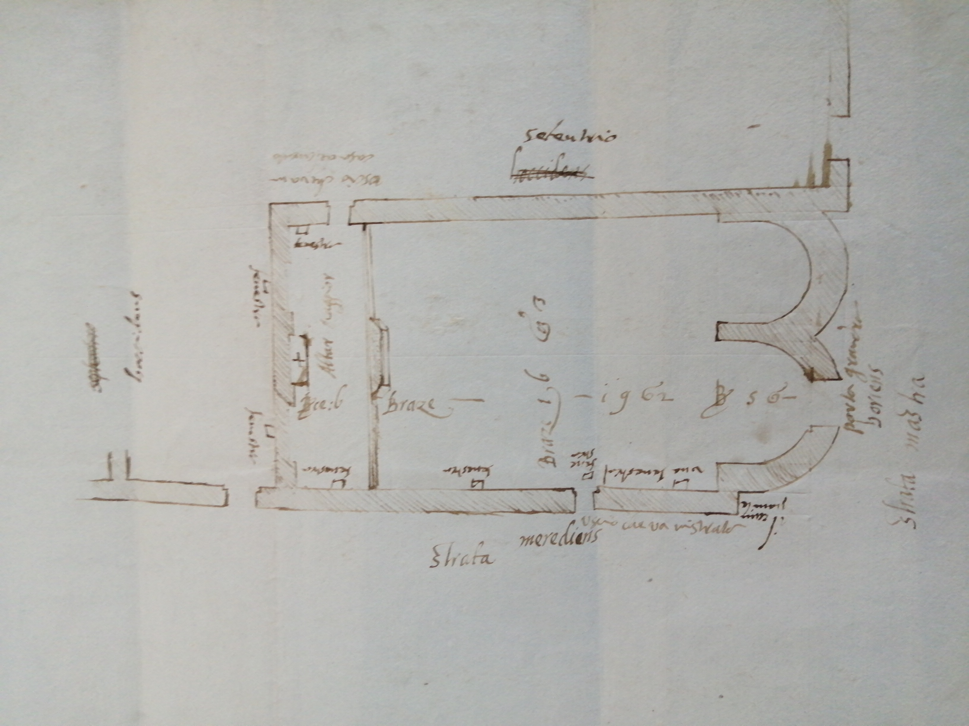 Originariamente a forma rettangolare lunga quaranta metri e larga circa dodici, con tetto e tegole sostenute da cinque travature, venne successivamente restaurata come attestato da un documento inedito del 27 settembre 1584 (ASMi, Notarile, 16288) scoperto e studiato da Stefano Della Torre che ci permette di entrare in possesso di ulteriori interessanti informazioni. In primo luogo dato che il restaurato avvenne per volontà di una nobildonna appartenente alla famiglia Nosiggia possiamo dedurre che oltre alla via Nuxigie anche l’edificio di culto dipendesse dalla famiglia Nosiggia (ed è interessante essere a conoscenza del fatto che da essa provengono due zii del cardinale Carlo Borromeo, ossia i due fratelli Giovanni Angelo Medici e Gian Giacomo Medici; il primo più noto come papa Pio IV ed il secondo celebre condottiero milanese e marchese di Melegnano). In secondo luogo scopriamo una sorta di incertezza circa l’esecutore delle opere di restauro dato che mentre il Torre le attribuisce ad Angelo Puttini ed il Lattuada all’architetto Antonio Maria Corbetta il recente documento le attribuisce all’ingegnere Giuseppe Meda. Di fatto la chiesa venne ricostruita in modo che vi fossero una facciata ornata con paraste di ordine ionico, il portale d’ingresso era sormontato da una statua del santo patrono e l’interno fosse ad unica navata caratterizzata dalla presenza di tre cappelle con volta (come attestato dall’immagine allegata trovata durante il lavoro di informatizzazione degli indici cartacei e collocata presso l’Archivio Storico Diocesano di Milano, Sezione X, Serie “San Fedele”, Volume 56, Fascicolo 8, Sottofascicolo 2).