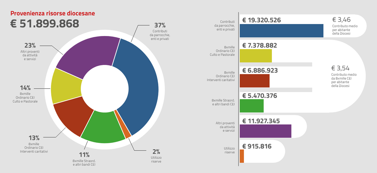 Si tenga presente che le somme provenienti dall’8xmille riportate ai fini del presente Bilancio di missione possono divergere da quelle documentate nel “Rendiconto relativo alla erogazione delle somme derivanti dall’otto per mille attribuite alla Diocesi dalla CEI per l’esercizio 2021” e pubblicate come da normativa sulla “Rivista Diocesana Milanese” (organo della Diocesi di Milano per gli atti ufficiali).