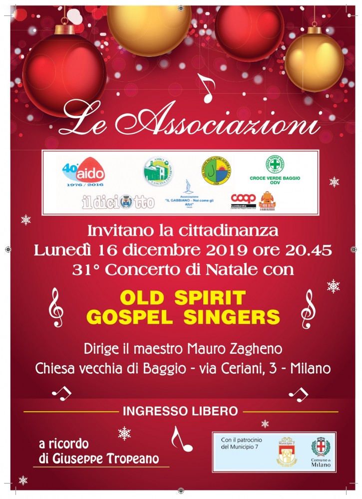 Lunedì 16 dicembre alle 20,45, presso la chiesa Vecchia di Baggio si terrà un Concerto di Natale in ricordo di Giuseppe Tropeano con la partecipazione del Coro “Old Spirit Gospel Singers”, diretto dal Maestro Mauro Zagheno.