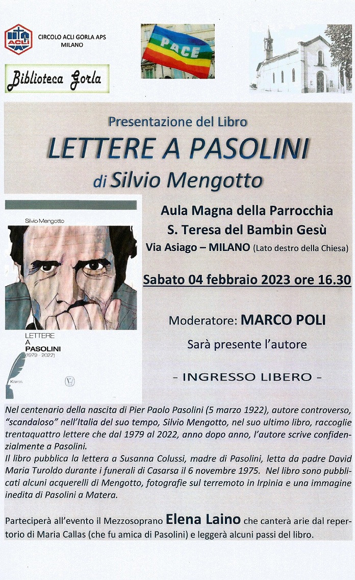 Sabato 4 febbraio alle 16.30 presso la parrocchia Santa Teresa del Bambin Gesù di Milano sarà presentato l’ultimo libro di Silvio Mengotto “Lettere a Pasolini”.