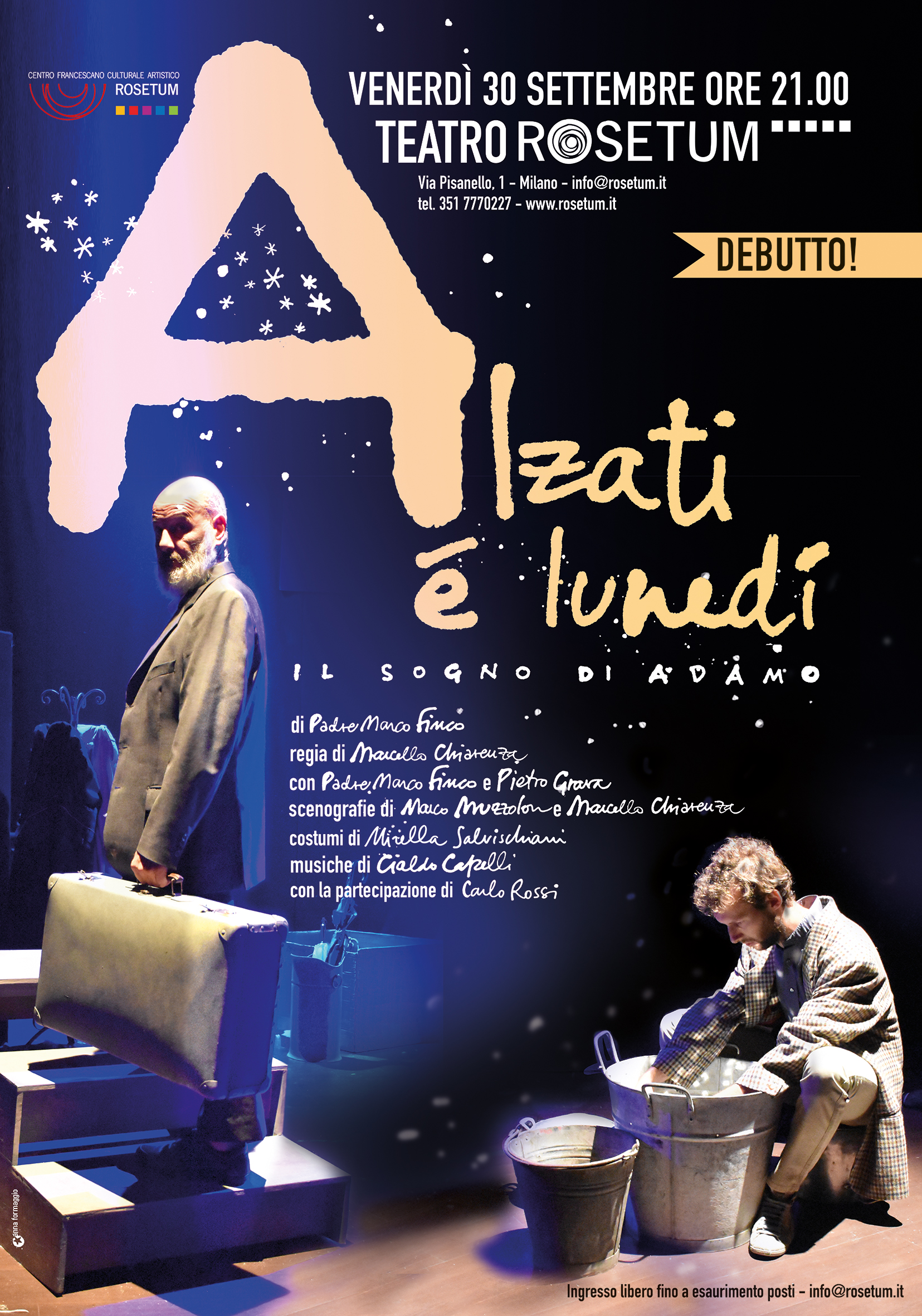 Venerdì 30 settembre alle ore 21, presso il Teatro Rosetum di Milano, debutto del nuovo spettacolo con Padre Marco Finco e Pietro Grava intitolato “Alzati è lunedì”.