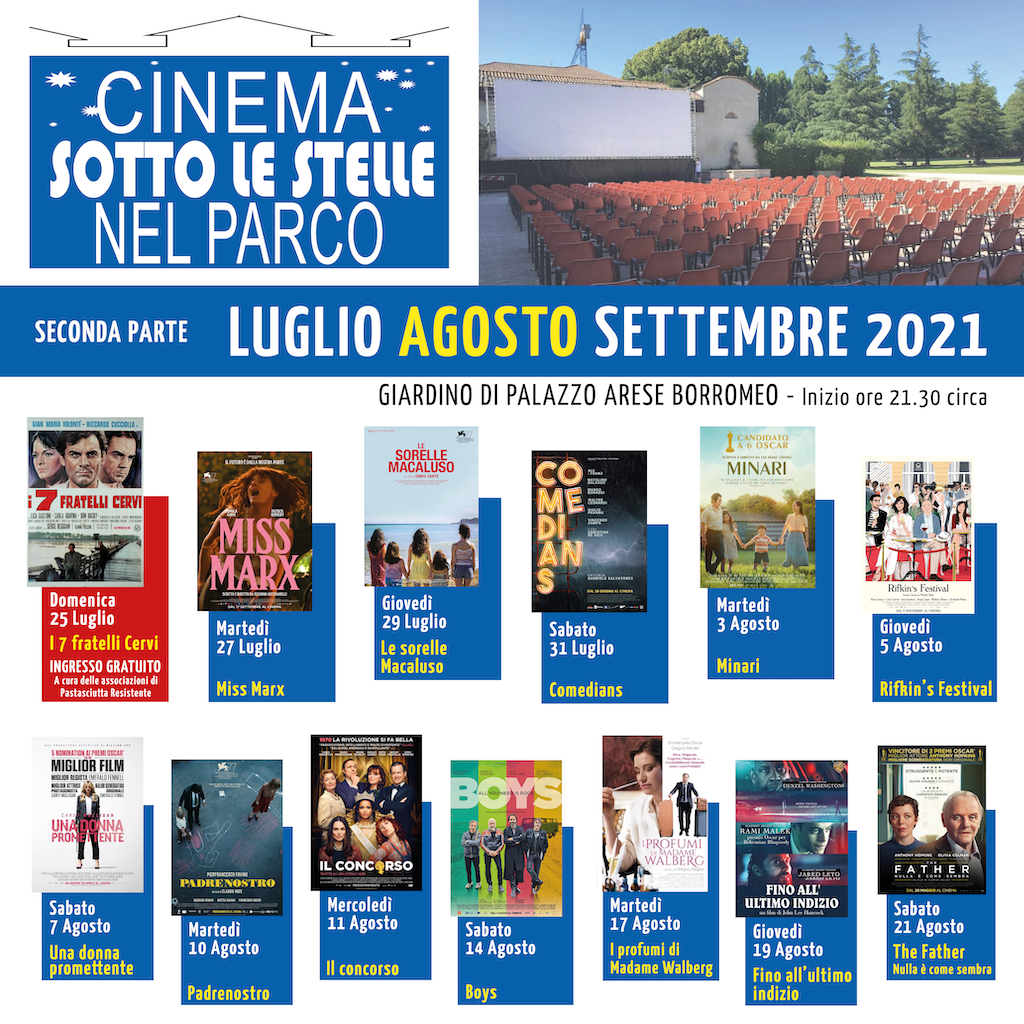 Il Circolo Culturale Don Bosco propone un altro mese di proiezioni serali in partenza già da domenica 25 luglio, con l’ingresso gratuito per la proiezione di “I 7 fratelli Cervi” a cura delle associazioni di “Pastasciutta Resistente”. Martedì 27 luglio sarà la volta di “Miss Marx”e giovedì 29 di “Le sorelle Macaluso”. Sabato 31 luglio arriverà “Comedias”, martedì 3 agosto “Minari” e giovedì 5 “Rifkin’S Festival”. Sabato 7 agosto in programma la proiezione di “Una donna promettente”, martedì 10 “Padrenostro”, mercoledì 11 “Il concorso”, sabato 14 “Boys”, martedì 17 “I profumi di madame Walberg”, giovedì 19 “Fino all’ultimo indizio”, per chiudere questa parte di proposte sabato 21 agosto, con una nuova proiezione di “The Father”.