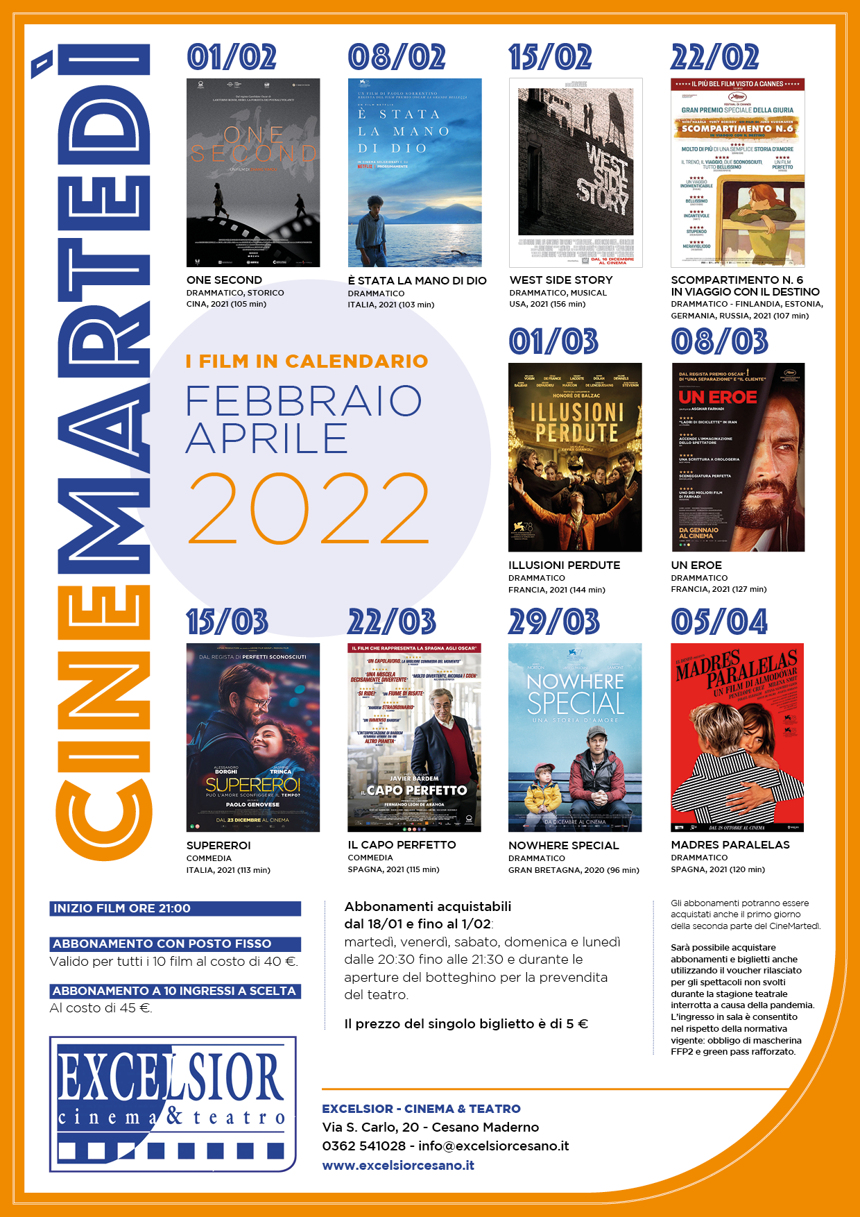 Sempre insieme, sempre al cinema, anche da febbraio ad aprile 2022. L’Excelsior Cinema&Teatro propone la seconda parte del “CineMartedì”, con la programmazione di altre dieci pellicole. Nessuna pausa dunque, per dare modo agli appassionati di continuare a sedersi in sala con un appuntamento, nel totale rispetto delle regole di sicurezza necessarie per la pandemia da Covid 19, che vuole essere anche occasione per fare, e vivere, la Comunità.