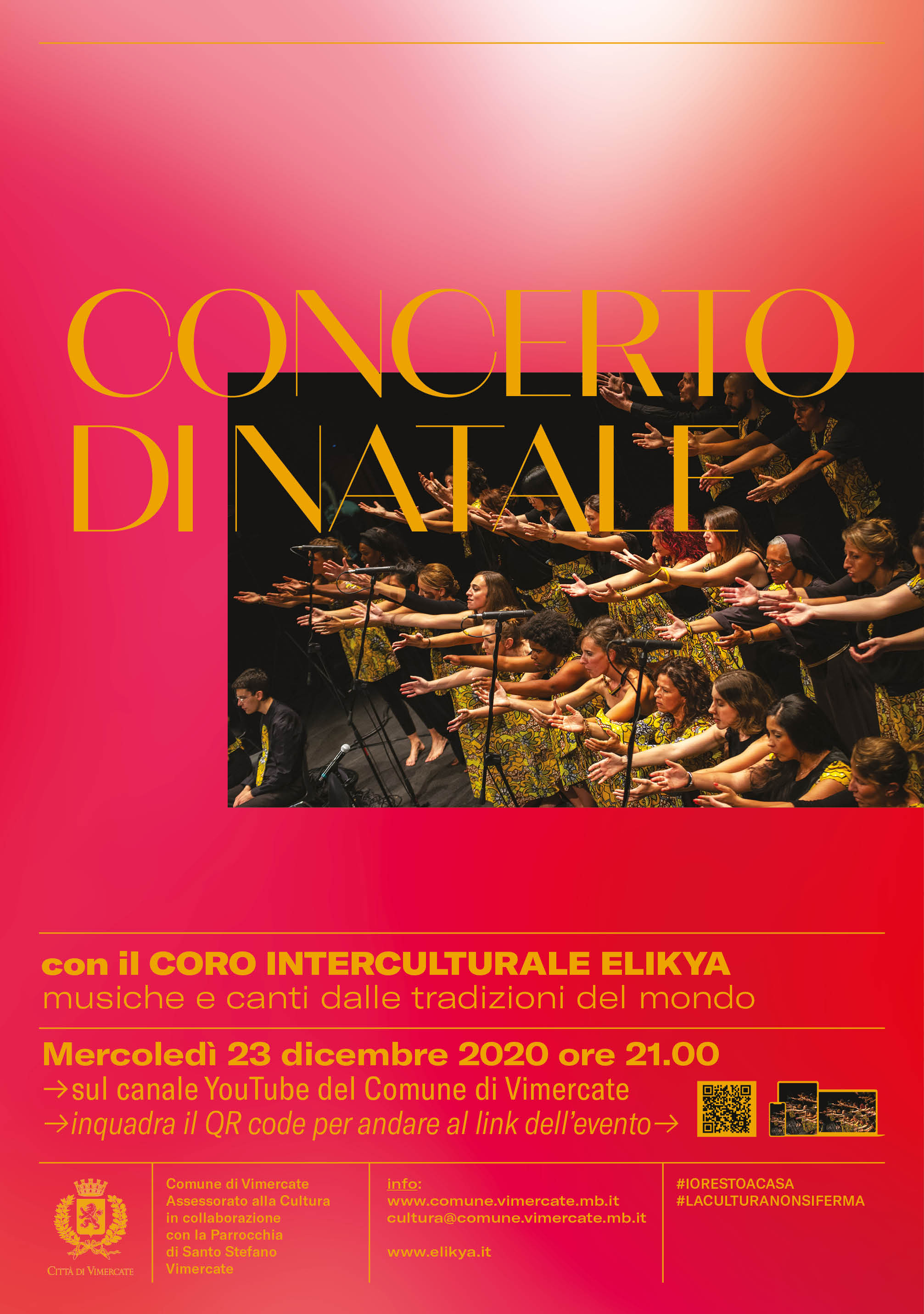 Mercoledì 23 dicembre, dal Santuario della Beata Vergine del Rosario di Vimercate (evento gratuito a porte chiuse) in streaming a partire dalle 21 sul Canale YouTube del Comune di Vimercate, concerto di Natale con musiche e canti delle tradizioni del mondo con il coro interculturale Elikya. L’evento, organizzato dall’Assessorato alla Cultura di Vimercate in collaborazione con la parrocchia di Santo Stefano, è stato ideato e organizzato per regalare al pubblico un momento di gioia a ridosso delle festività natalizie.