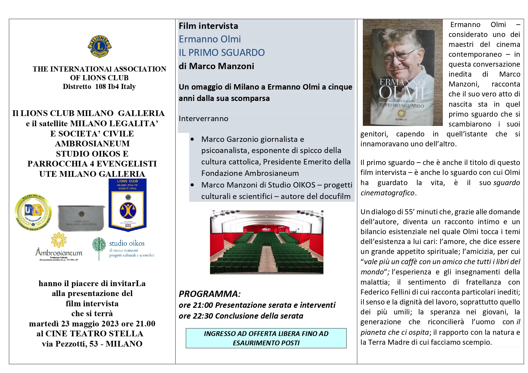 Martedì 23 maggio alle 21 presso il  Cineteatro Stella (via Pezzotti, 53) a Milano si terrà la replica del film-intervista di Marco Manzoni “Ermanno Olmi. Il primo sguardo”, presentato in anteprima assoluta lunedì 8 maggio al Centro Culturale San Fedele.
