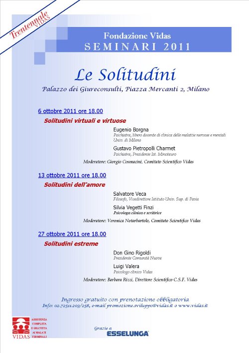 Giovedì 6 ottobre, alle ore 18.00, presso Palazzo dei Giureconsulti (Piazza Mercanti 2) a Milano, avranno inizio i Seminari vidas 2011 sul tema “Le solitudini”. Un universo esistenziale che tocca tutte le età della vita, condizione inevitabile: la solitudine può essere dolorosa ma anche fonte di riflessione e di virtuosa creatività.