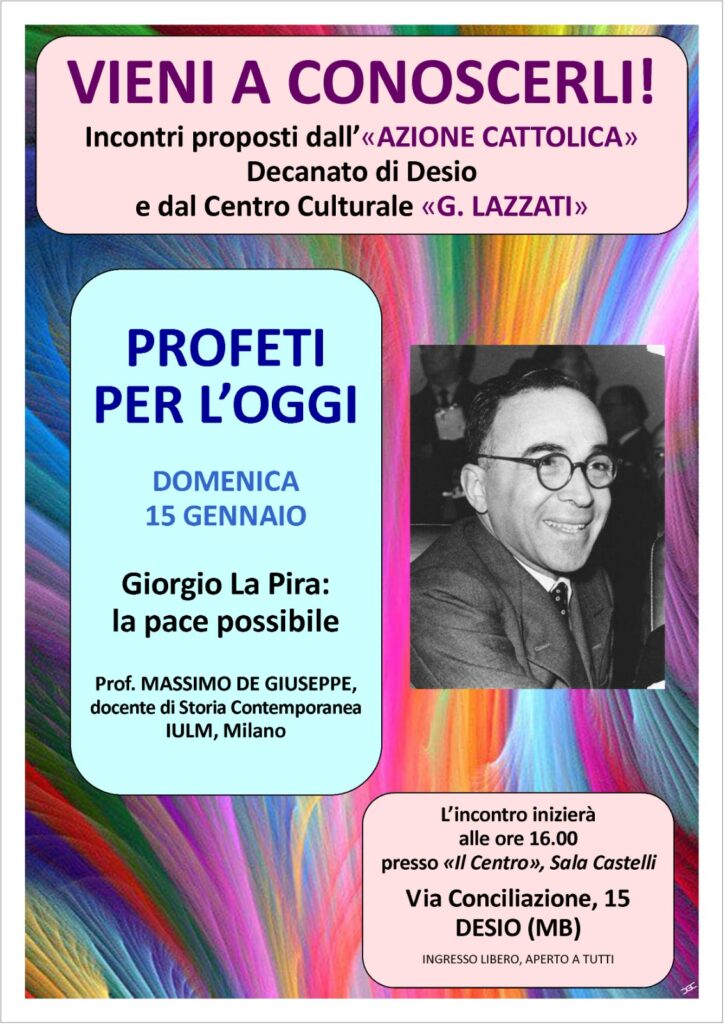 Giorgio La Pira, il sindaco “santo” di Firenze negli anni della Guerra fredda, testimone di una “pace possibile” è il protagonista di una conferenza promossa dell’Azione cattolica del decanato di Desio e dal Centro culturale Lazzati in programma, domenica 15 gennaio, alle 16 presso il Centro Sala Castelli di via Conciliazione a Desio. Interviene il professor Massimo De Giuseppe, docente di Storia contemporanea allo Iulm di Milano.