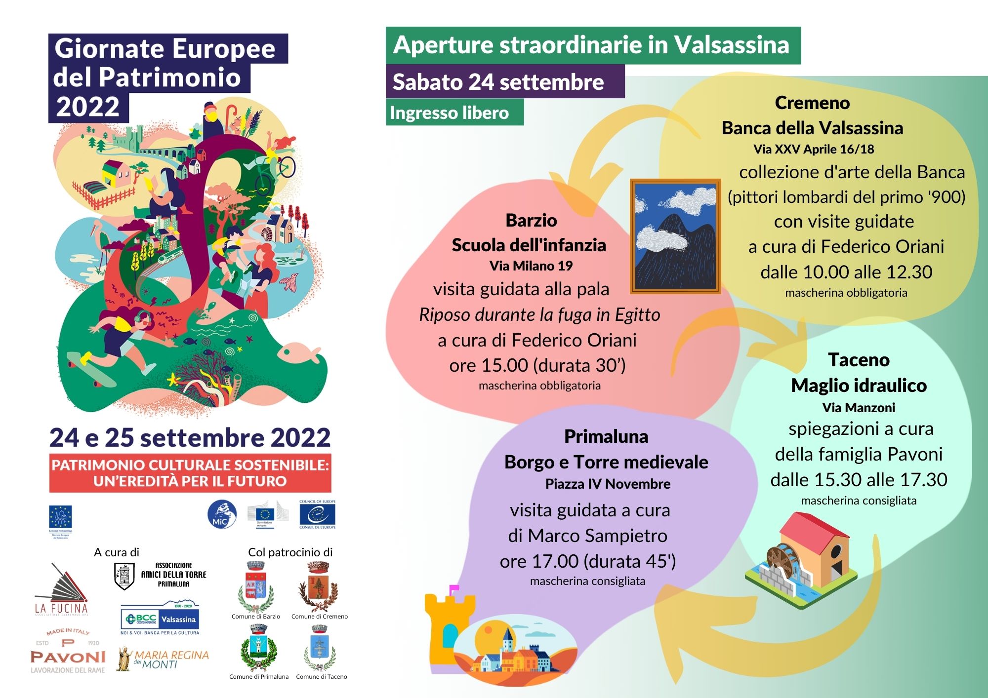 La Giornata Europea del Patrimonio in Valsassina è realizzata da La Fucina – associazione culturale APS e dagli Amici della Torre di Primaluna – associazione culturale, grazie alla disponibilità della Banca della Valsassina, di Pavoni Snc, della Comunità Pastorale Maria Regina dei Monti, e del Comune di Primaluna e alla collaborazione del Comune di Cremeno e della Biblioteca Civica Uberto Pozzoli di Lecco.