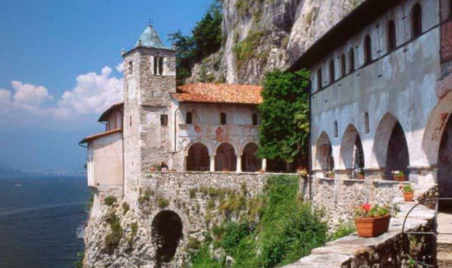 La costruzione del complesso di Santa Caterina vedrebbe le sue origini secondo la tradizione nel XII secolo, quando Alberto Besozzi, mercante e usuraio del tempo, scampando a un naufragio durante una traversata del lago, avrebbe fatto voto a santa Caterina d’Alessandria di ritirarsi per il resto della sua vita in preghiera e solitudine in una grotta in quel tratto di costa.