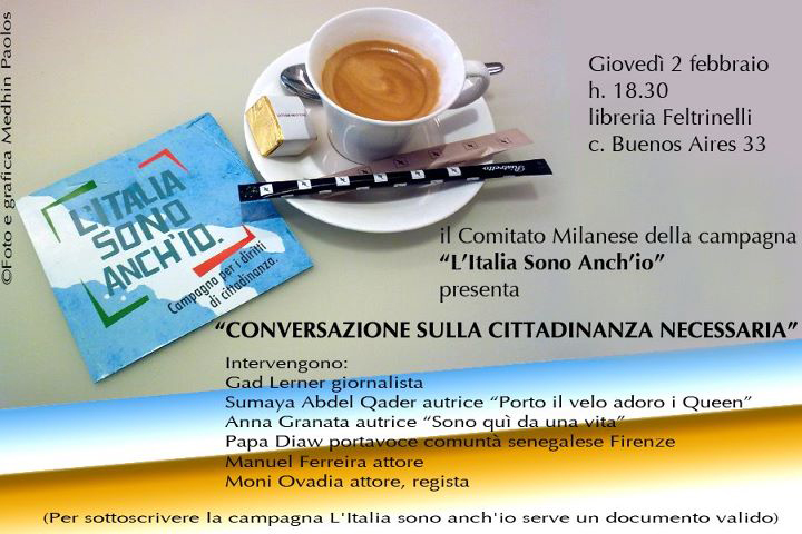 Giovedì 2 febbraio, alle 18, presso la Libreria Feltrinelli (corso Buenos Aires 33, Milano), il comitato milanese della campagna “L’Italia sono anch’io” presenta “Conversazione sulla cittadinanza necessaria”.