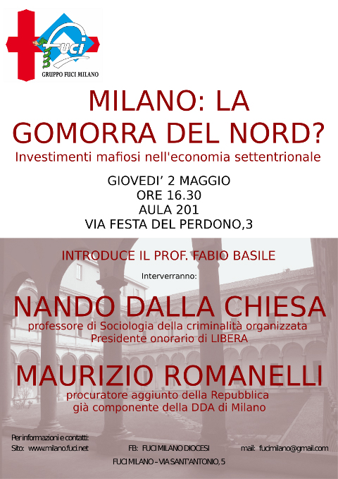 “Milano: la Gomorra del nord?” è il tema dell’incontro organizzato dal Gruppo Fuci di Milano per giovedì 2 maggio, alle 16.30, in via Festa del Perdono 3 (aula 201) a Milano.