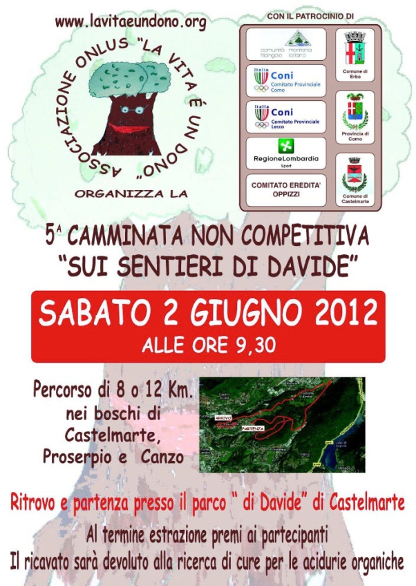 Sabato 2 giugno, presso il “Parco di Davide” a Castelmarte (Como), partirà la Camminata di solidarietà “Sui sentieri di Davide”, giunta quest’anno alla sua quinta edizione. L’inizio dell’evento, aperto a tutti, è previsto per le 9.30 e durerà fino al pomeriggio con la Camminata, l’estrazione a premi e il pranzo organizzato dall’oratorio di Castelmarte.