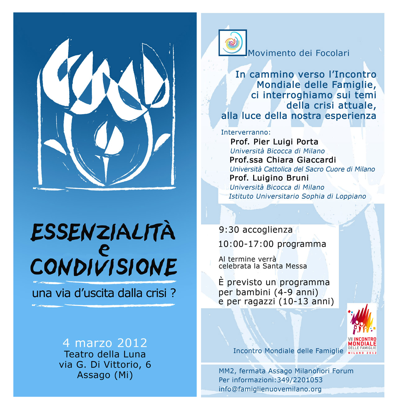 “Essenzialità e Condivisione” è il tema dell’incontro che il Movimento dei Focolari organizza il 4 marzo al Forum di Assago in preparazione all’Incontro mondiale delle Famiglie.