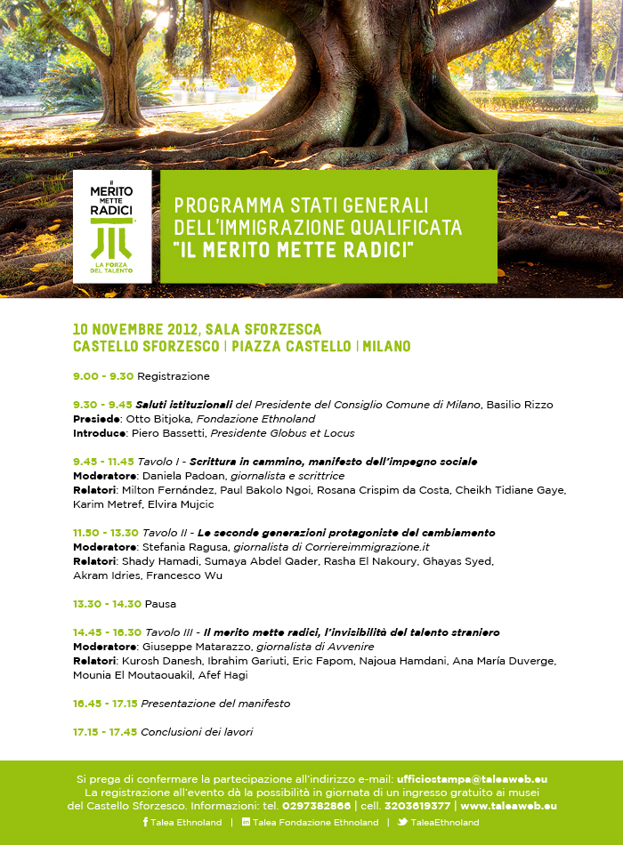 “Il merito mette radici” è il tema della due-giorni all’insegna della cultura meritocratica, con il Talent Welcome Day dei nuovi cittadini italiani (venerdì 9 novembre a Palazzo Greppi – Università degli Studi di Milano, via Sant’Antonio 12) e gli Stati generali dell’immigrazione qualificata (sabato 10 novembre al Castello Sforzesco).