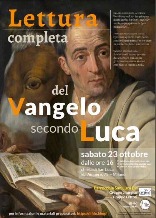 Sabato 23 ottobre nella chiesa di San Luca Evangelista (via Ampère, 75, Milano) si terrà la lettura continua e completa del Vangelo secondo Luca. Un’occasione unica per raccogliere la comunità intorno alla Parola, e riscoprire il Vangelo come «racconto del lieto annuncio» nella sua interezza.