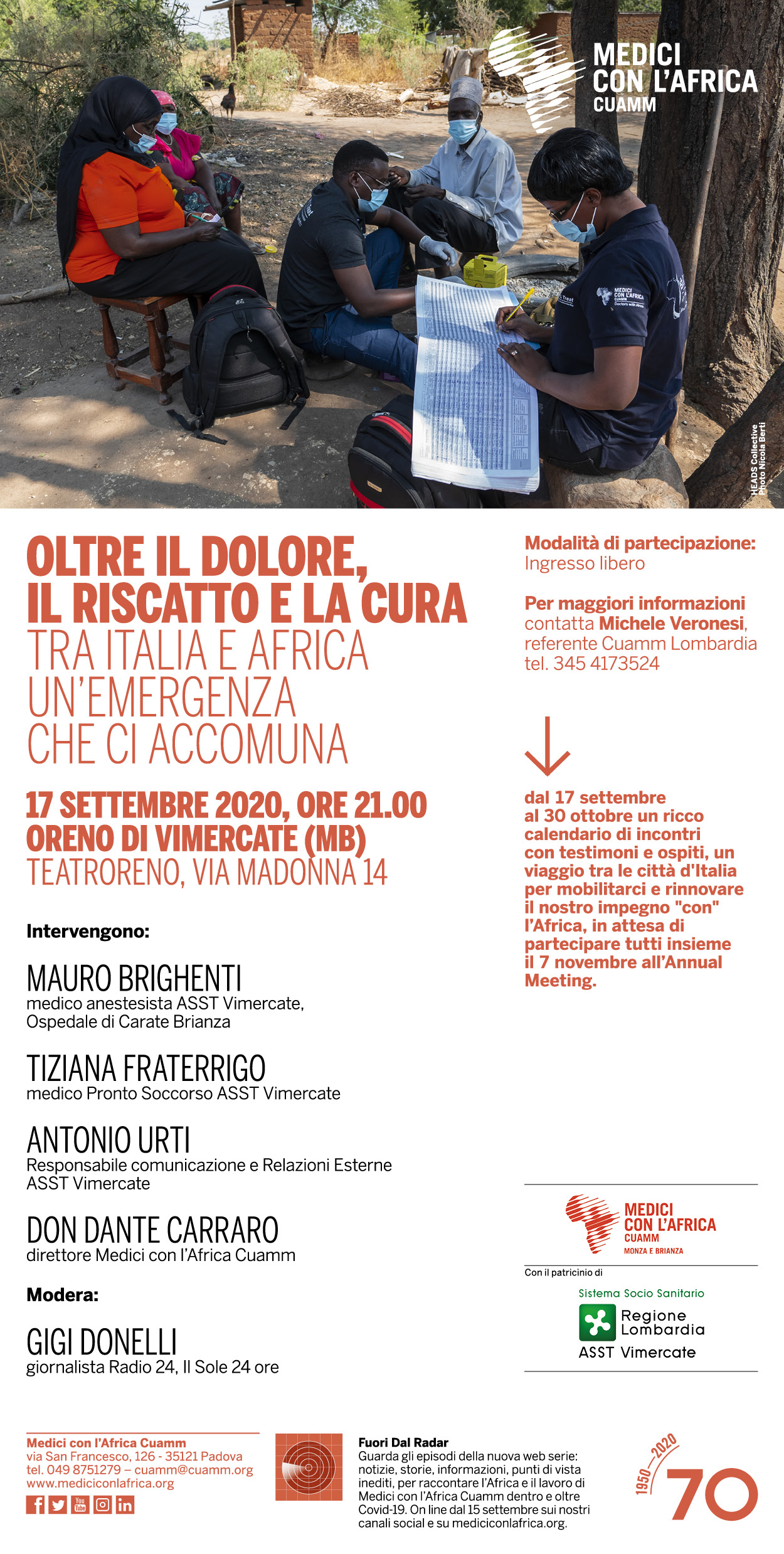 L’appuntamento è per giovedì 17 settembre alle ore 21.00 presso il TeatrOreno a Oreno di Vimercate (MB): intervengono don Dante Carraro, direttore di Medici con l’Africa Cuamm e alcuni medici e rappresentanti dell’ASST di Vimercate sul tema “Oltre il dolore, il riscatto e la cura tra Italia e Africa un’emergenza che ci accomuna”.