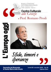 «L’Europa oggiۚ: sfide, timori e speranze» è il tema della conferenza esclusiva del professor Romano Prodi, che si terrà lunedì 28 novembre, alle 18 nella suggestiva cornice della sacrestia del Bramante nello splendido complesso di Santa Maria delle Grazie in via Caradosso 1 a Milano.