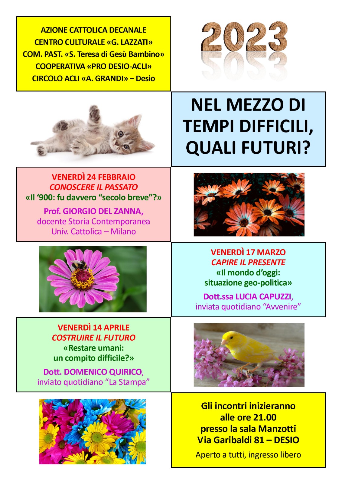 Tre serate, da febbraio ad aprile, che, come si intuisce dal titolo del ciclo («Nel mezzo di tempi difficili quali futuri?»), sono accomunate dallo sforzo di capire il passato e il presente, con il desiderio di guardare al futuro, tracciandone alcuni possibili scenari.