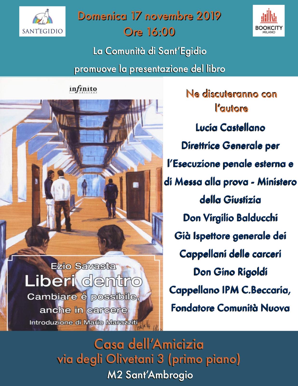 Per questo presenta alle ore 16 il libro “Liberi dentro. Cambiare è possibile anche in carcere” di Ezio Savasta (Infinito Edizioni, 2019) con Lucia Castellano, direttrice generale per l’esecuzione penale esterna e di messa alla prova del Ministero della Giustizia, don Virgilio Balducchi, già ispettore generale dei cappellani d’Italia, e don Gino Rigoldi, cappellano dell’Ipm Beccaria e fondatore di Comunità Nuova.