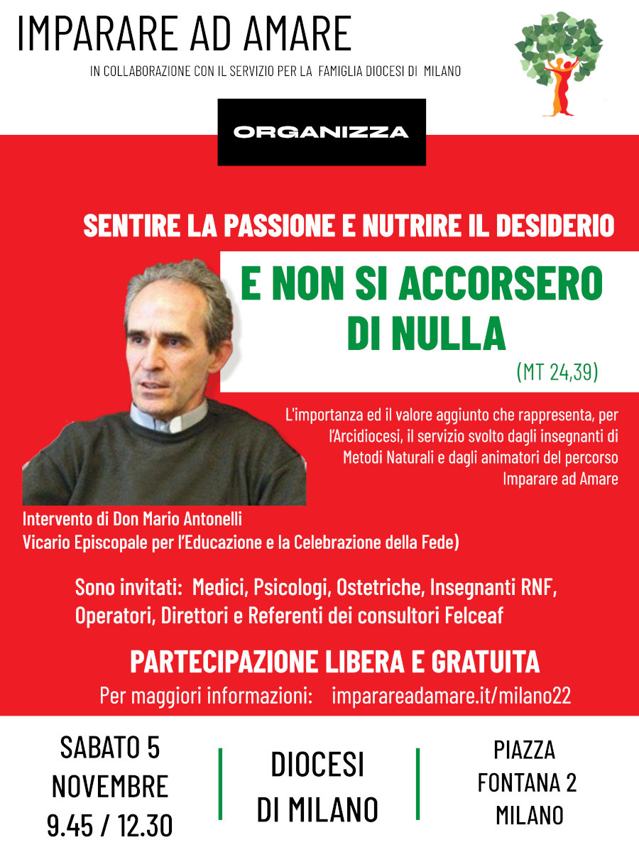 Sabato 5 novembre, dalle 9.45 alle 12.30, presso la Curia arcivescovile di Milano, si terrà un interessante incontro con don Mario Antonelli sul tema dell’importanza e del valore aggiunto rappresentato dal servizio svolto dagli insegnanti di Metodi Naturali e dagli animatori del percorso «Imparare ad Amare».