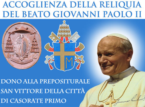 Sabato 14 gennaio 2012 alle ore 09,30, presso la Chiesa Prepositurale Parrocchiale San Vittore della Città di Casorate Primo, si svolgerà la solenna accoglienza della Reliquia del Beato Giovanni Paolo II, donata alla Comunità parrocchiale casoratese.