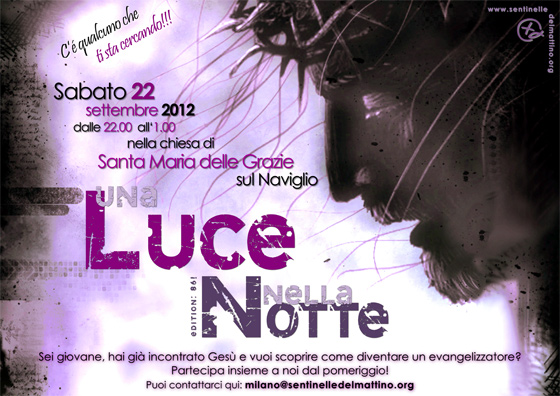Eccoci, quindi, a invitare anche te ad unirti ai giovani di diverse parrocchie della nostra diocesi che nella serata di sabato, 22 settembre 2012 si daranno da fare per portare ad altri quel poco di Gesù che hanno incontrato nella loro vita, aprendo una chiesa di notte e mettendosi in gioco per Lui in prima persona nell’86esima edizione di Una Luce nella Notte!