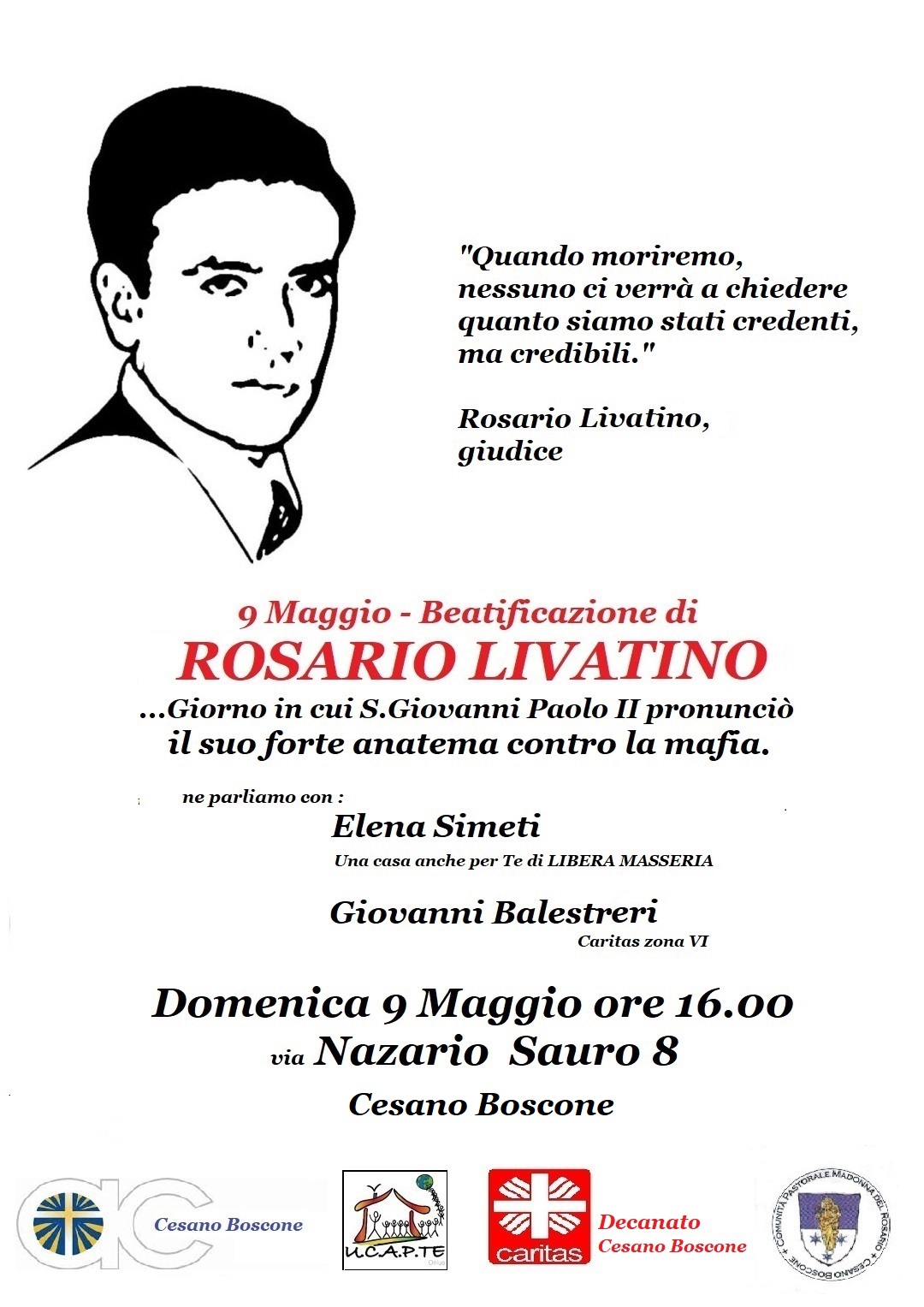 Domenica 9 maggio, alle 16, in occasione della beatificazione del giudice Rosario Livatino, l’Azione cattolica e la Caritas del Decanato, Ucapte Onlus e la Comunità pastorale Madonna del Rosario, organizzano un incontro di riflessione su “Mafia e territorio” che si svolgerà in via Nazario Sauro 8 a Cesano Boscone.