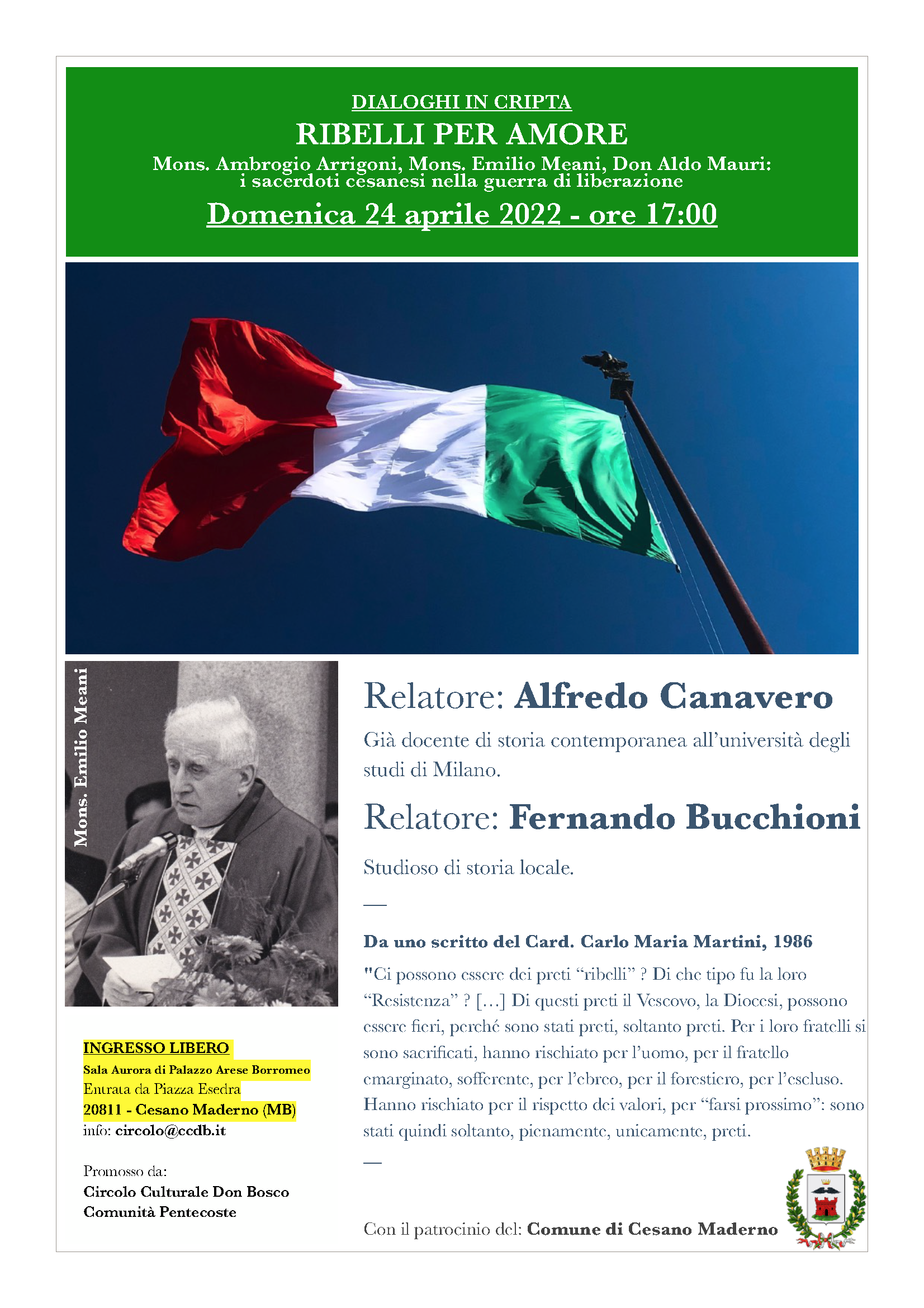 Alla vigilia del 25 aprile, domenica 24 alle 17:00, si terrà in sala Aurora di Palazzo Arese Borromeo una nuova tappa del ciclo di incontri culturali e approfondimenti. I relatori si concentreranno sulla figura dei sacerdoti cesanesi nella guerra di Liberazione.