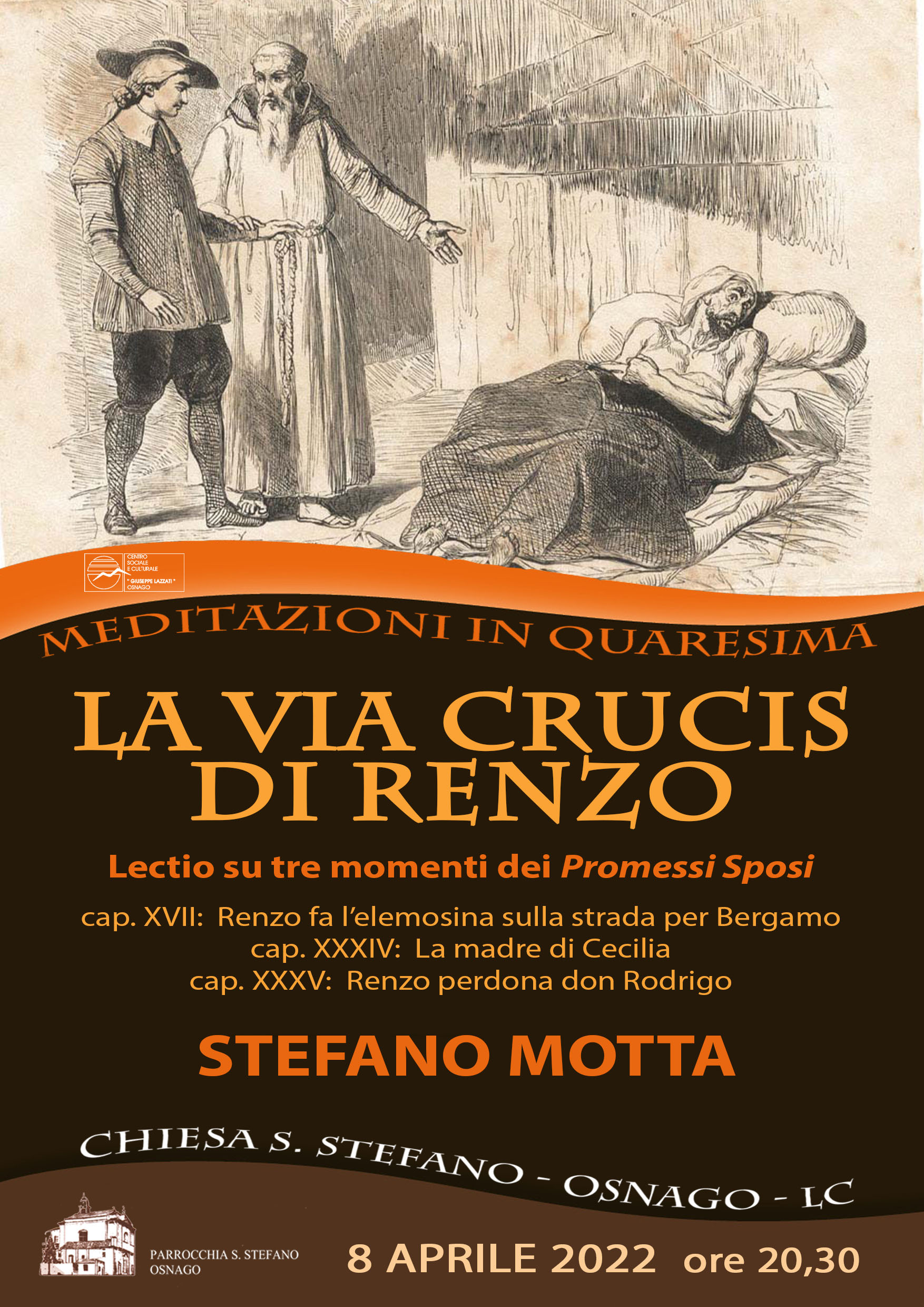 La parabola di Renzo Tramaglino nei “Promessi Sposi” è un romanzo di formazione a tappe, in cui il “povero cristo” montanaro e illetterato diventa allegoria del “povero Cristo”, di volta in volta martire, intercessore, salvatore. Dopo la suggestiva lectio sull’inno sacro “La Passione” di Manzoni di tre anni fa, Stefano Motta ritorna a guidarci attraverso le stazioni di questa via crucis letteraria e umana, tra arte e preghiera.