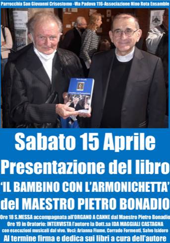 Sabato 15 aprile, nel salone dell’oratorio della parrocchia di San Giovanni Crisostomo a Milano (via Padova), avrà luogo la presentazione del libro «Il bambino con l’armonichetta», del maestro Pietro Bonadio. Il programma prevede alle 18 la Messa accompagnata dall’organo a canne suonato da Bonadio e alle 19 l’intervista all’autore, che eseguirà dal vivo alcuni brani musicali e poi si renderà disponibile per firmare copie.
