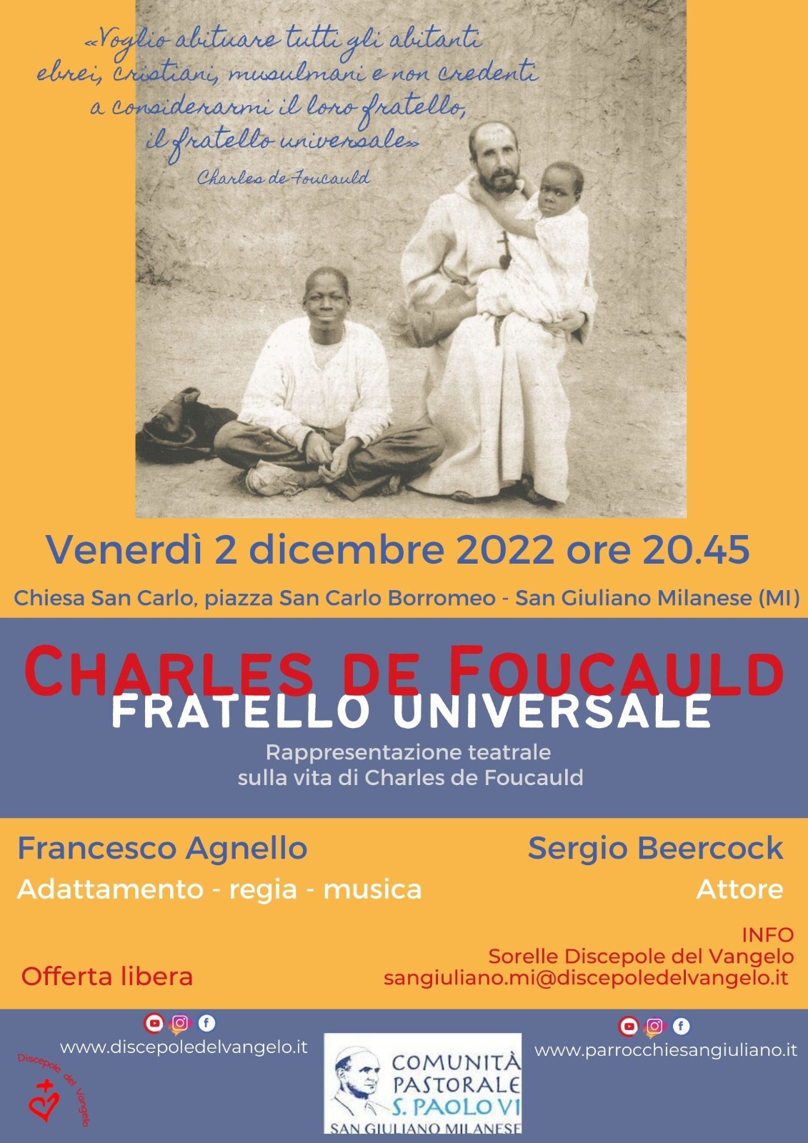 In occasione del 106° anniversario della morte di san Charles de Foucauld, venerdì 2 dicembre, presso la chiesa di San Carlo Borromeo a San Giuliano Milanese, alle ore 20.45, andrà in scena il monologo teatrale Charles de Foucauld fratello universale, ideato dal regista Francesco Agnello, che cura anche l’accompagnamento musicale, e interpretato dall’attore Sergio Beercock.