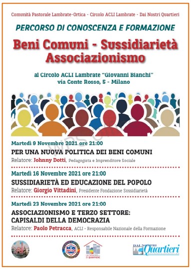 Il Circolo ACLI Lambrate ospita nella propria sede di via Conte Rosso 5 una serie di 3 incontri dedicati ai beni comuni, alla sussidiarietà e all’associazionismo.