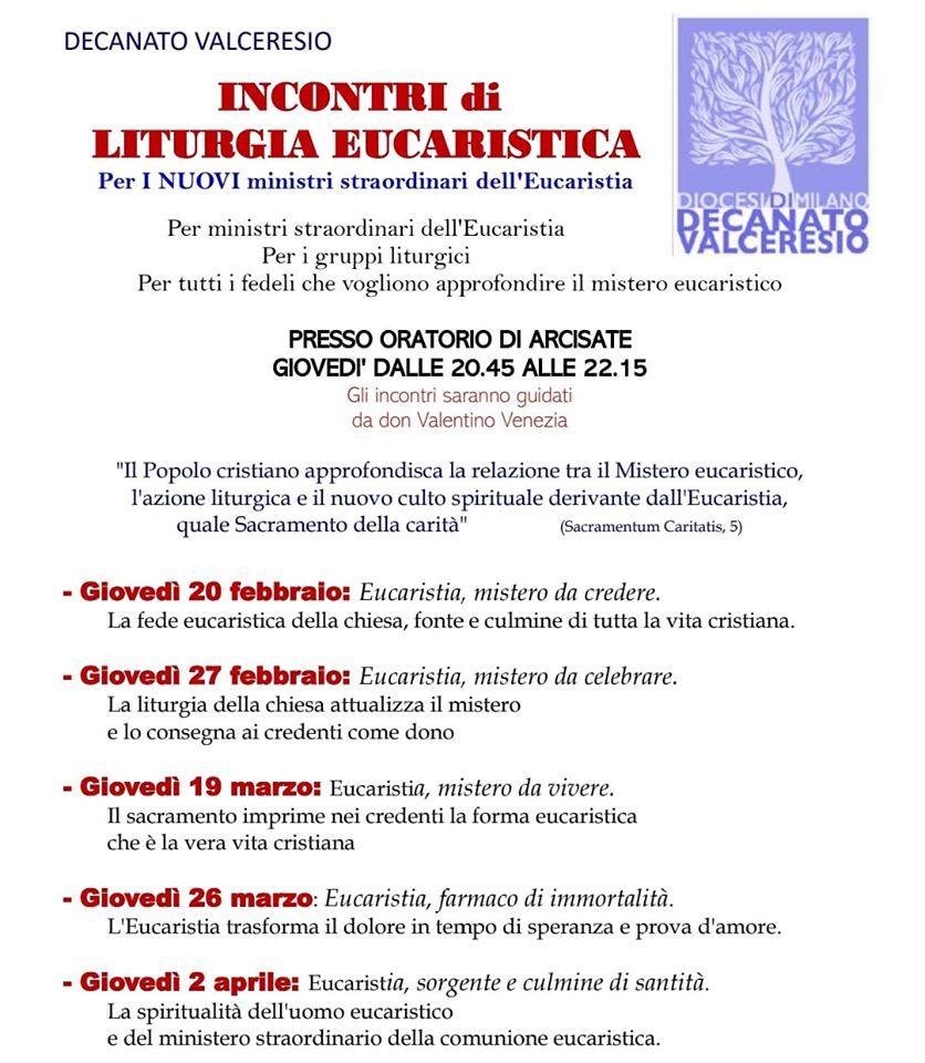 Cinque incontri, aperti anche ai gruppi liturgici e ai fedeli che desiderano approfondire il ministero eucaristico, che si terranno tutti presso l’Oratorio di Arcisate e saranno guidati da don Valentino Venezia.