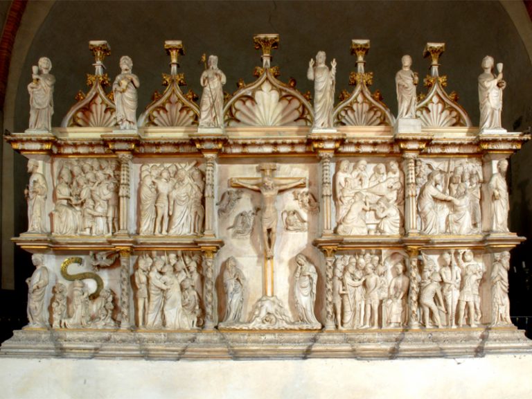 La formella centrale, “Crocefissione con la Vergine e San Giovanni”, attribuita al maestro Jacopino da Tradate, è considerata tra i maggiori capolavori della scultura milanese dei primi anni del 1400. Mons. Navoni presenterà le varie tappe della passione del Signore, dall’agonia nel Getsemani alla deposizione, alla discesa agli inferi di Cristo che libera Adamo: in tal modo l’artista ha voluto presentare in maniera unitaria il mistero della redenzione operata da Cristo, morto e risorto.