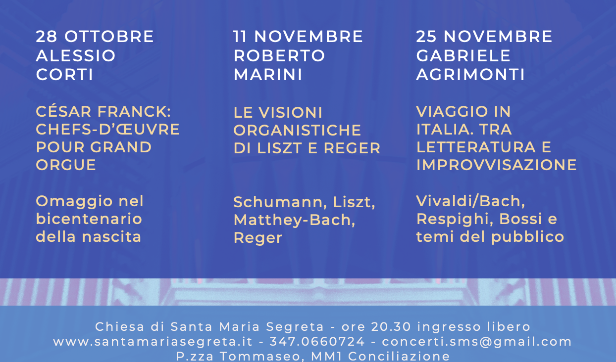 Il primo appuntamento è per venerdì 28 ottobre, alle 20.30, quando il maestro Alessio Corti proporrà un omaggio a Cesar Frank, in occasione del bicentenario della nascita del musicista. I concerti proseguiranno venerdì 11 novembre con «Le visioni organistiche di Liszt e Reger», a cura di Roberto Marini, e venerdì 25 novembre con «Viaggio in Italia. Tra letteratura e improvvisazione», a cura di Gabriele Agrimonti. Oltre a questi concerti d’organo, fino all’Epifania si terranno anche i consueti appuntamenti di «Musica nella liturgia», a partire da mercoledì 1 novembre, festa di Ognissanti, alle ore 10.30, con Santa Maria Segreta Ensemble. Per informazioni: 347.0660724