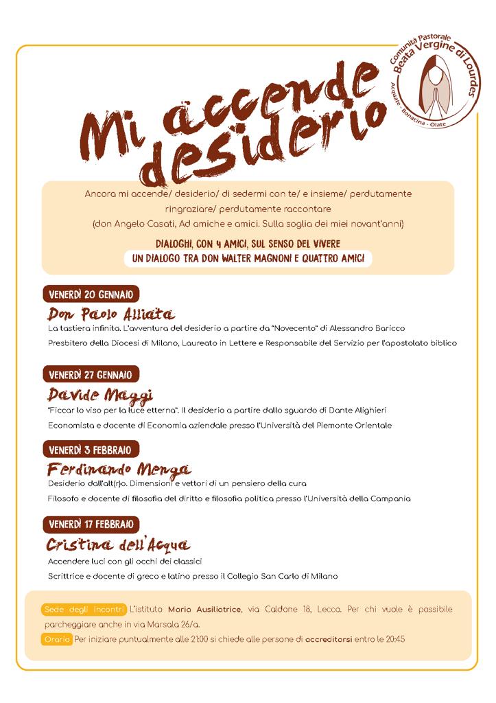 Il 3 febbraio il filosofo Ferdinando Menga ha scelto come titolo del suo intervento: Desiderio dall’alt(r)o. Dimensioni e vettori di un pensiero della cura. I temi di fondo saranno quello del dialogo tra generazioni e del modo con cui vivere gli inevitabili conflitti. Infine, sarà Cristina Dell’Acqua a chiudere il percorso con un balzo indietro nel tempo sino all’incontro con i classici. Come possono dei testi così antichi essere in grado d’illuminare il presente? Sono le grandi pagine di autorevoli pensatori ad avere in sé la forza per interrogare l’umano e accendere domande e desideri. Come giustamente afferma José Tolentino Mendonça “Parlare dei tempi della nostra vita è parlare delle domande con le quali ci confrontiamo”.