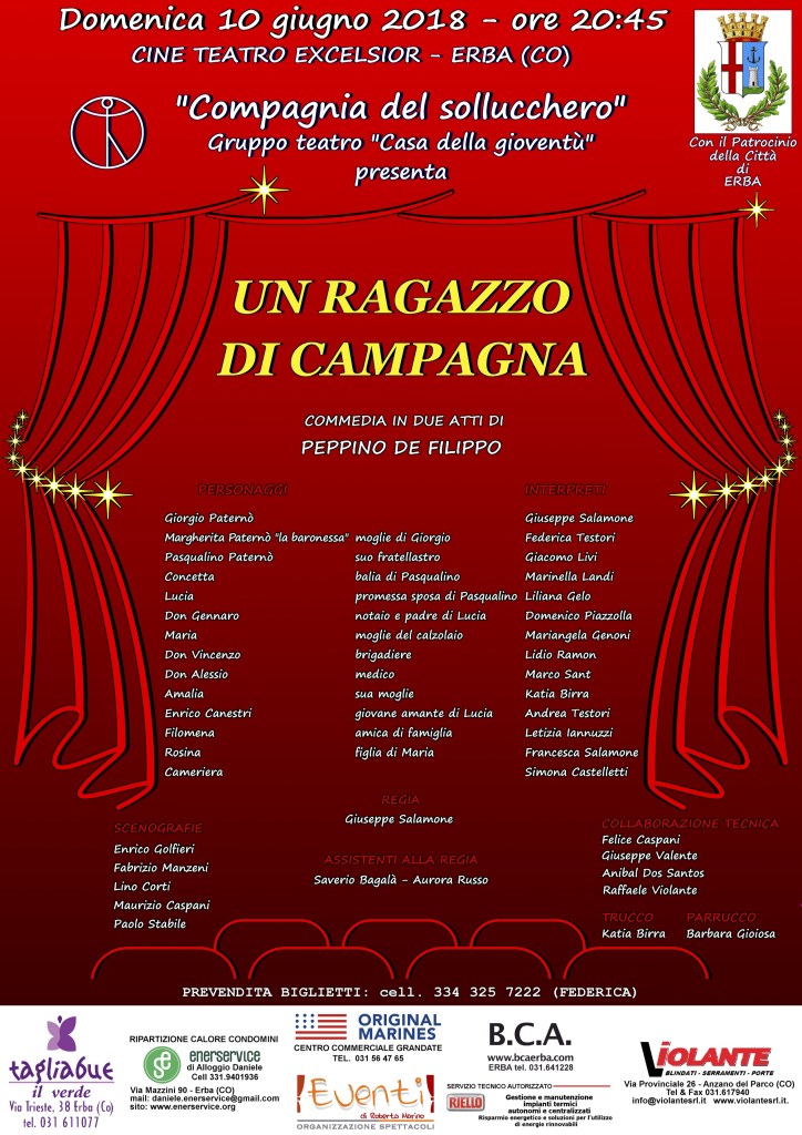 Domenica 10 giugno alle 20.45, presso il Cine-Teatro Excelsior di Erba, la “Compagnia del sollucchero”, Gruppo teatro “Casa della Gioventù” presenta lo spettacolo “Un ragazzo di campagna”, commedia in due atti di Peppino de Filippo, portata sul palco grazie all’attore regista Giuseppe Salamone