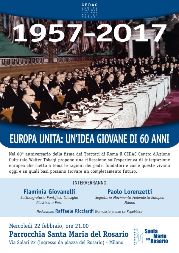 In occasione dei 60 anni dalla firma dei Trattati di Roma sulla nascita della famiglia europea, il Centro d’azione culturale “Walter Tobagi” (Cedac) della Parrocchia di S. Maria del Rosario organizza per mercoledì 22 febbraio alle ore 21 in Piazza del Rosario a Milano una serata sul tema “Europa unita: un’idea giovane di 60 anni”.