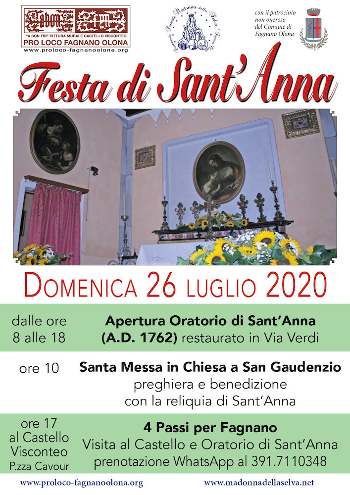 Domenica 26 luglio 2020 la Pro Loco Fagnano Olona, in collaborazione con la Comunità Pastorale Madonna della Selva e con il patrocinio del Comune di Fagnano Olona, promuove tre momenti di festa.