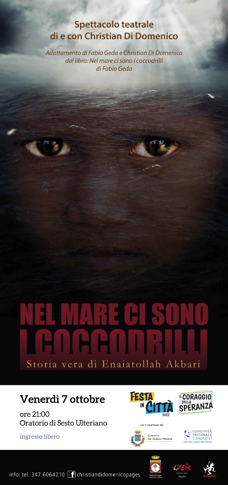 Il terzo appuntamento è venerdì 7 ottobre all’oratorio di San Marziano a Sesto Ulteriano. Andrà in scena lo spettacolo teatrale “nel mare ci sono i coccodrilli” adattamento di Christian di Domenico, tratto dal romanzo di Fabio Geda. La trama è la storia vera di Enaiatollah Akbari, un ragazzo fuggito a 10 anni dall’Afghanistan, arrivato in Italia dopo mille peripezie.