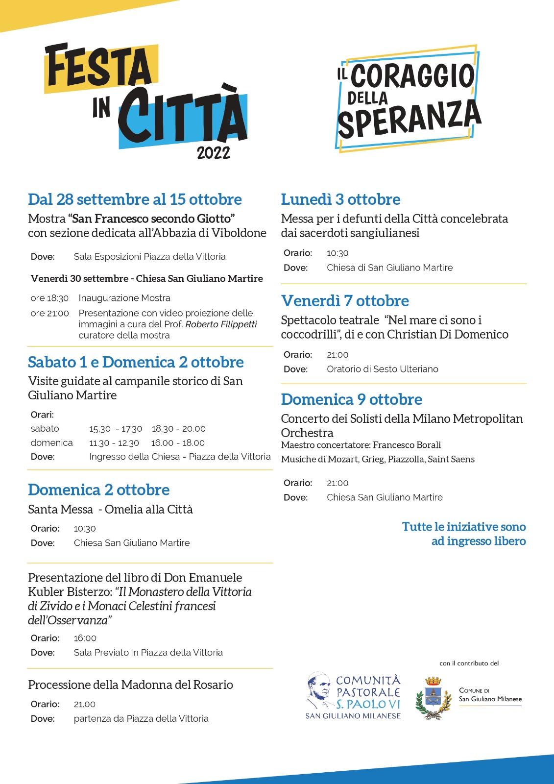 A San Giuliano Milanese la Festa Patronale dedicata alla Madonna del Rosario, è ritenuta, in collaborazione con l’amministrazione comunale, la Festa della Città. Da diversi anni anni si è pensato anche di dare un titolo che facesse da “filo conduttore”, agli eventi organizzati.