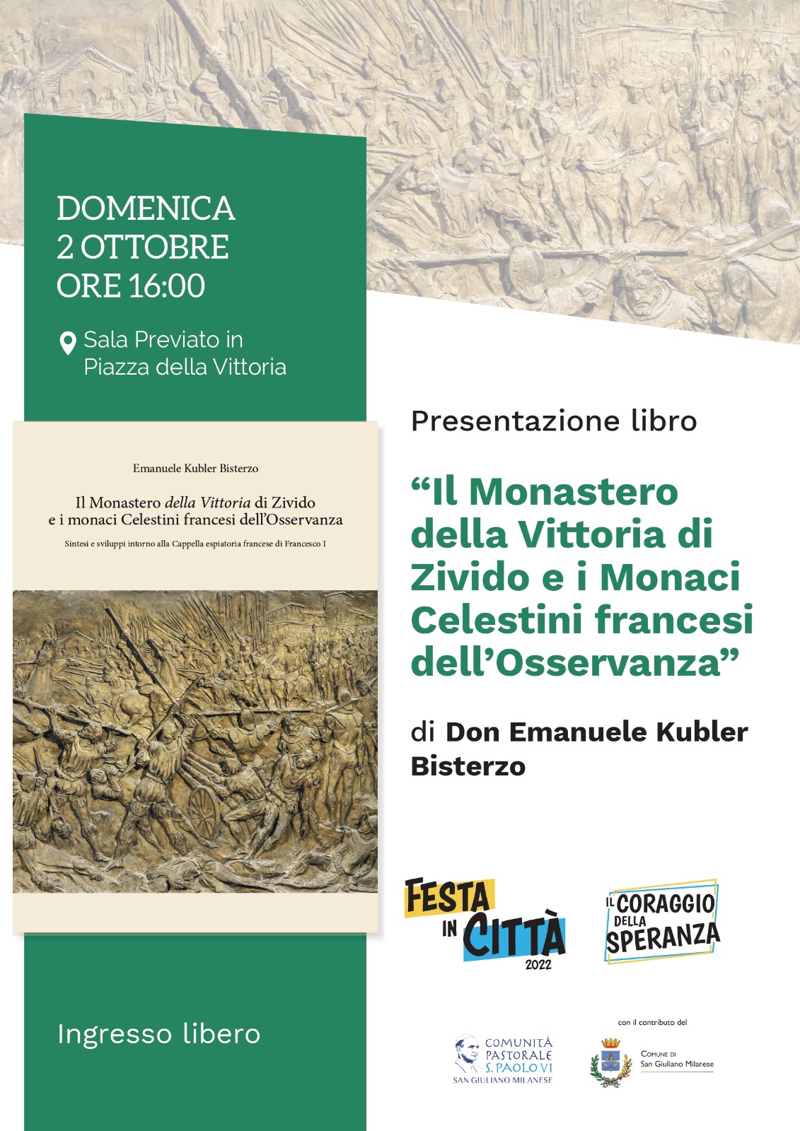 Il secondo appuntamento è la presentazione del libro di don Emanuele Kubler Bisterzo “Il Monastero della Vittoria di Zivido e i Monaci Celestini francesi dell’Osservanza”. Don Emanuele, appassionato di storia, è Vicario nella Comunità Pastorale. Arrivato in città nel 2008, ha iniziato a interessarsi della storia del territorio, a cominciare dalla storica Battaglia del Giganti, tra svizzeri e Francesi, qui combattuta nel 1515.