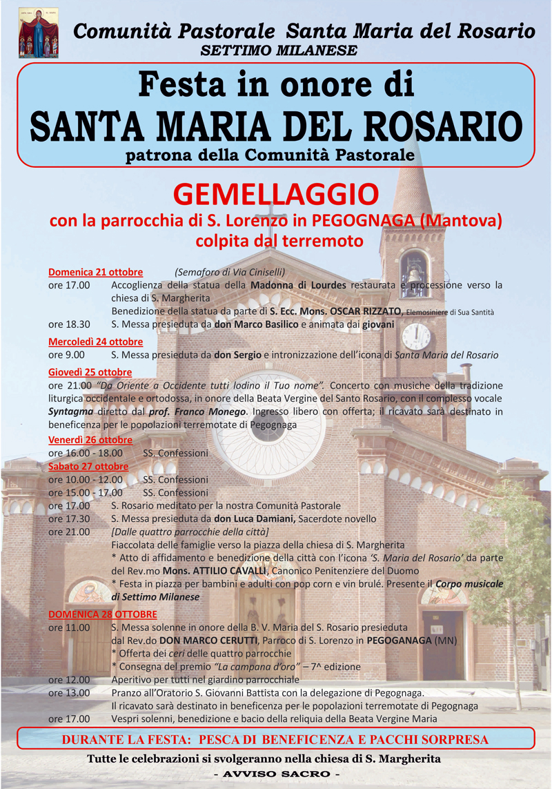 La Festa è anche loccasione per il gemellaggio con la parrocchia di Pegognaga (diocesi di Mantova), colpita dal terremoto della primavera scorsa.