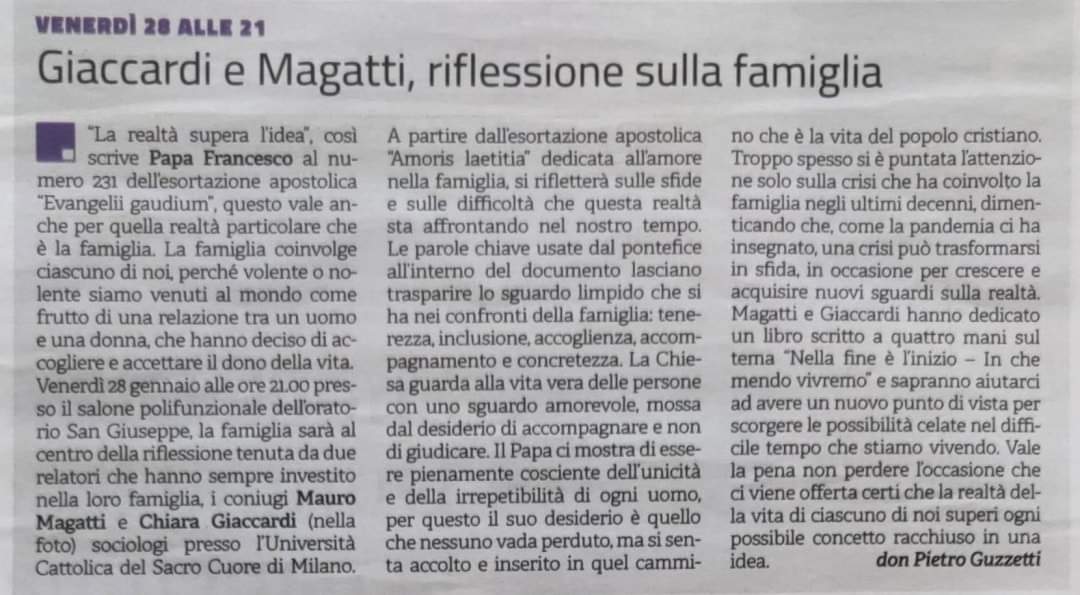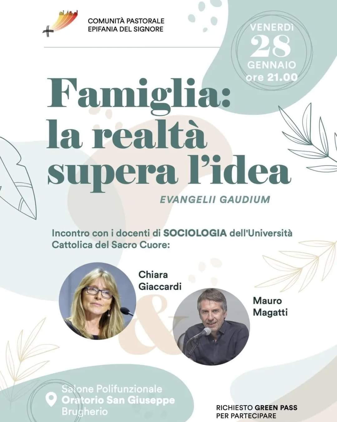 Venerdì 28 gennaio alle ore 21 presso il salone polifunzionale dell’oratorio San Giuseppe di Brugherio, si terrà un incontro molto interessante con due docenti di sociologia dell’Università cattolica del Sacro Cuore: Chiara Giaccardi e Mauro Magatti.