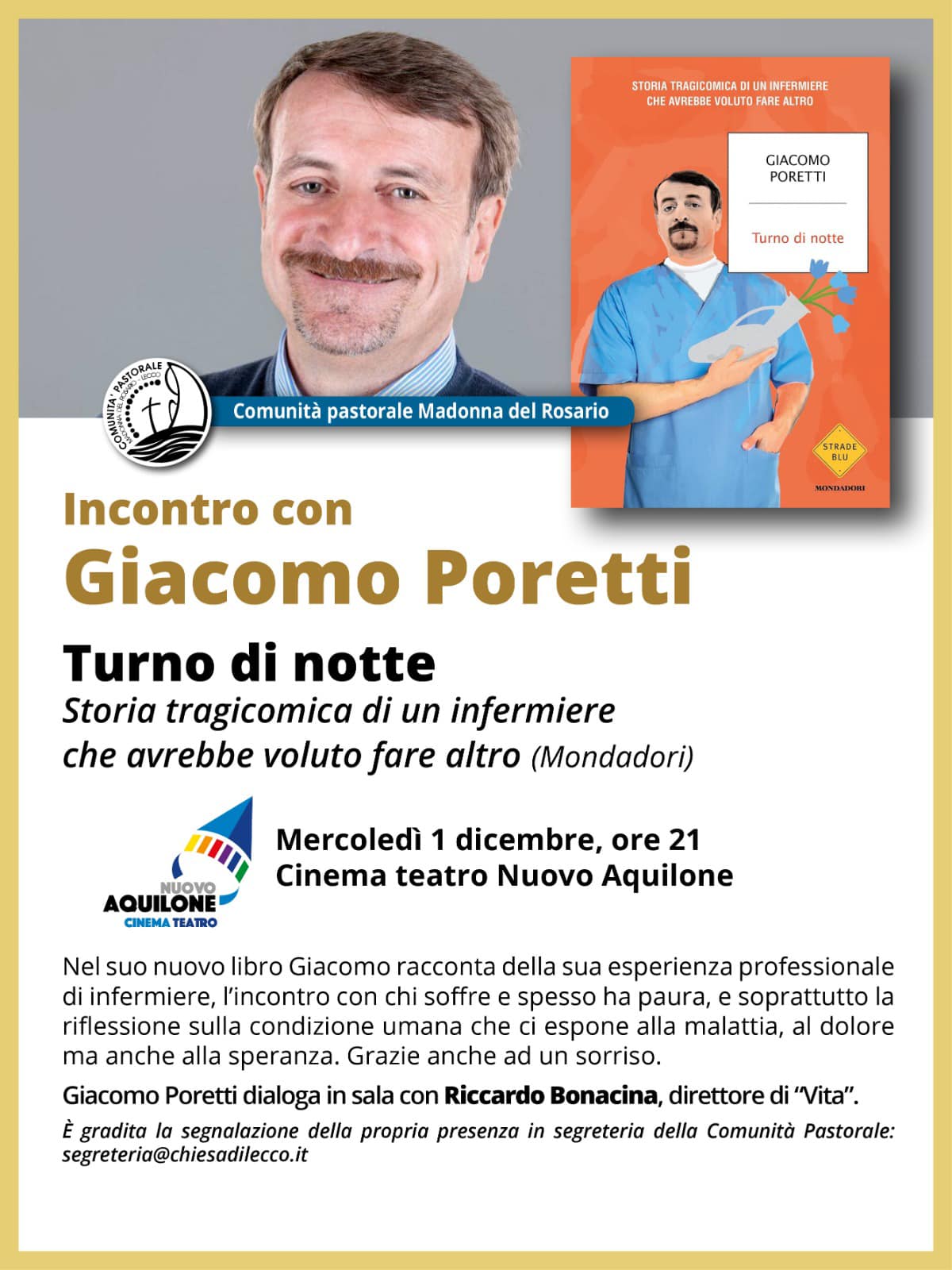 Mercoledì 1 dicembre alle ore 21 presso il Cinema Teatro Nuovo Aquilone si terrà un incontro con Giacomo Poretti. Intervistato da Riccardo Bonacina, direttore di Vita, Giacomo Poretti ripercorre la sua esperienza professionale di infermiere, di incontro con chi soffre e spesso ha paura riflettendo sulla condizione umana che si espone alla malattia, al dolore ma anche alla speranza, spesso grazie anche a un sorriso.