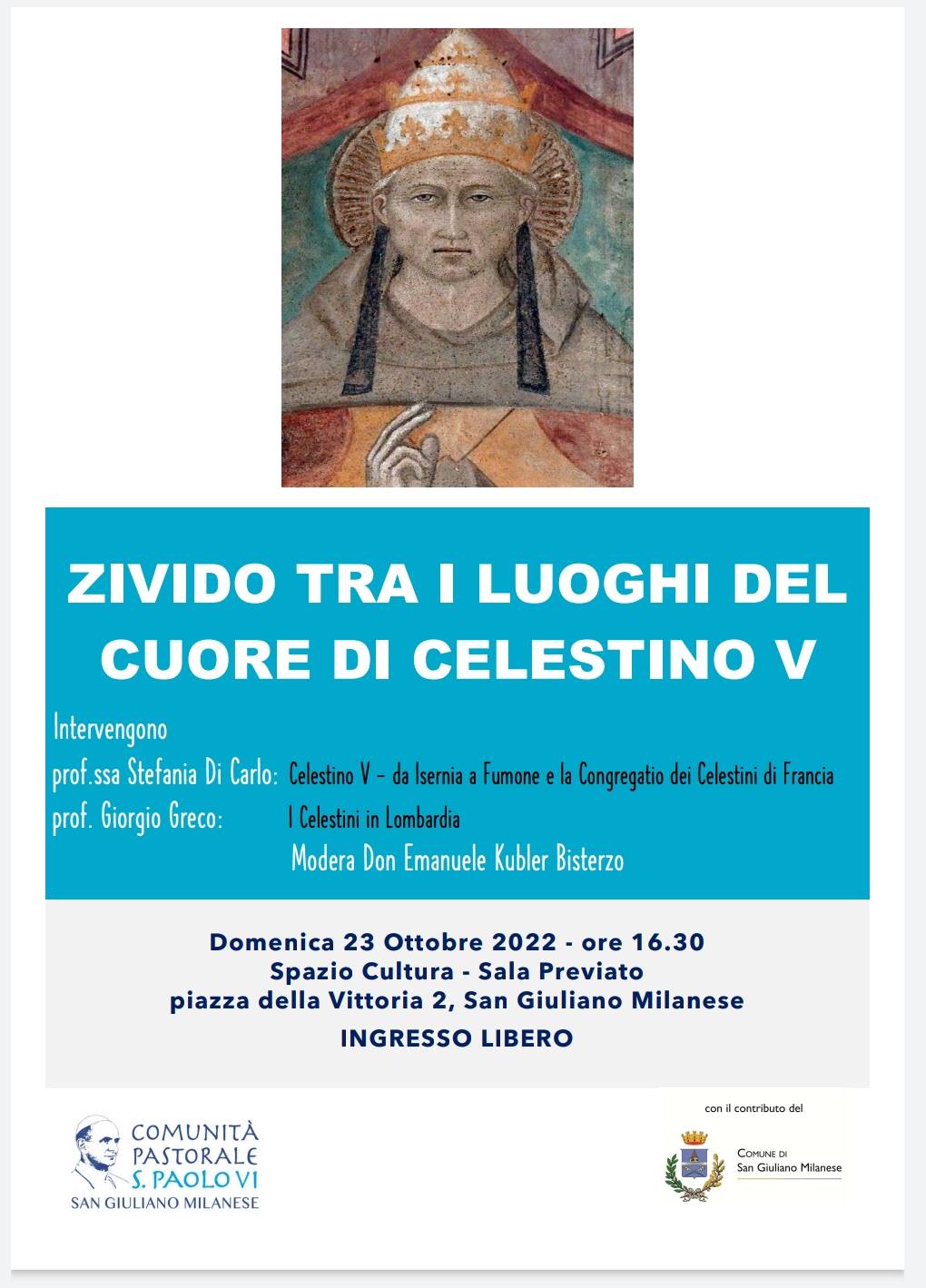 Domenica 23 ottobre alle 16.30 a San Giuliano Milanese, (in Sala Previato, nell’ex municipio di piazza della Vittoria) si terrà una conferenza molto interessante con la professoressa Stefania Di Carlo, docente di Storia della Chiesa Antica e Medievale dell’Istituto Superiore di Scienze Religiose “Fides et Ratio” dell’Aquila, e il prof. Giorgio Greco, docente universitario di Milano, che ha pubblicato studi sulla presenza dei Celestini in Lombardia, entrambi esperti della storia dei Celestini (da Papa Celestino V – Isernia 1215 circa, Castello di Fumone – Frosinone) – 1296).