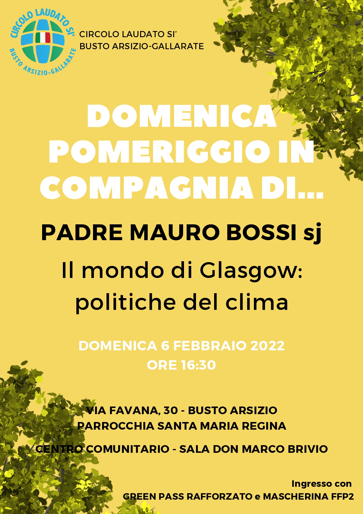 Domenica 6 febbraio il Circolo «Laudato si’» di Busto Arsizio – Gallarate promuove la prima iniziativa del 2022 aperta alla città. Per diffondere maggiormente i temi al centro dell’enciclica di papa Francesco, quest’anno il Circolo ha deciso di far ospitare le proprie iniziative di formazione e aggiornamento dalle diverse parrocchie della città. Così il primo incontro si svolgerà nella Sala Don Marco Brivio del Centro comunitario della parrocchia di Santa Maria Regina a Busto (via Favana 30): il pomeriggio sarà in compagnia di padre Mauro Bossi sj, che alle 16.30 parlerà di «Il mondo di Glasgow: politiche del clima». Per partecipare sono necessari il Green pass rafforzato e la mascherina ffp2.