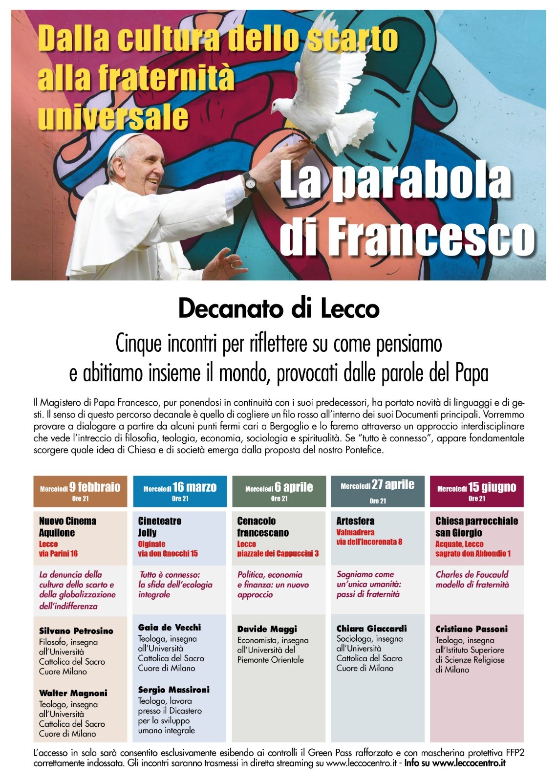 Per conoscere e comprendere meglio il Magistero di Papa Francesco, che pur ponendosi in continuità con i suoi predecessori, ha portato novità di linguaggi e di gesti, le parrocchie del Decanato di Lecco organizzano un ciclo di incontri dal titolo “Dalla cultura dello scarto alla fraternità universale: la parabola di Francesco”.